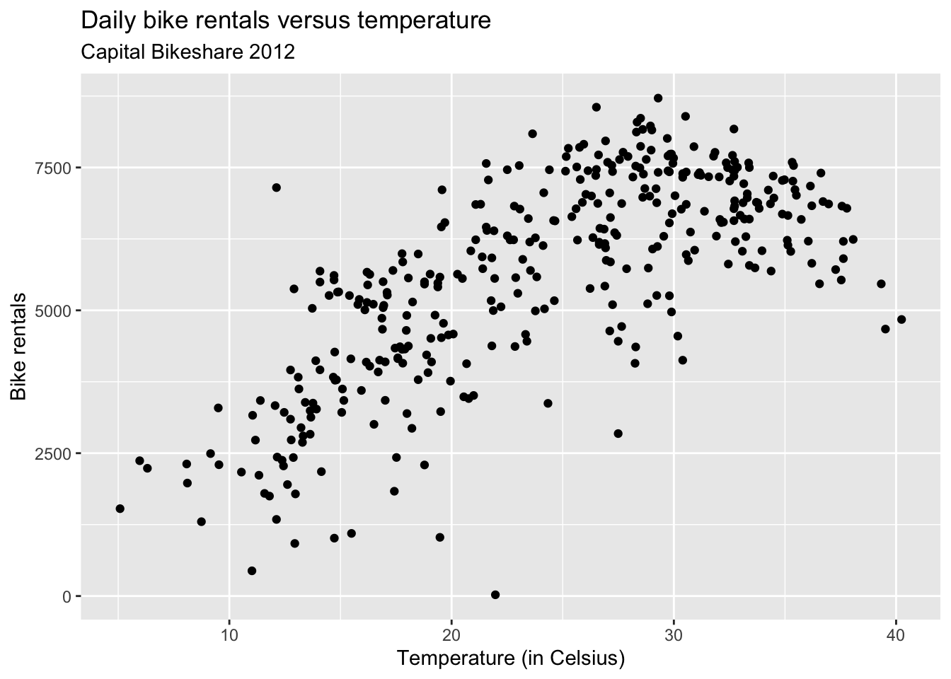 Task 2: The plot shows the relationship between the daily temperature and number of bike rentals in Washington, D.C.’s Capital Bikeshare in 2012.