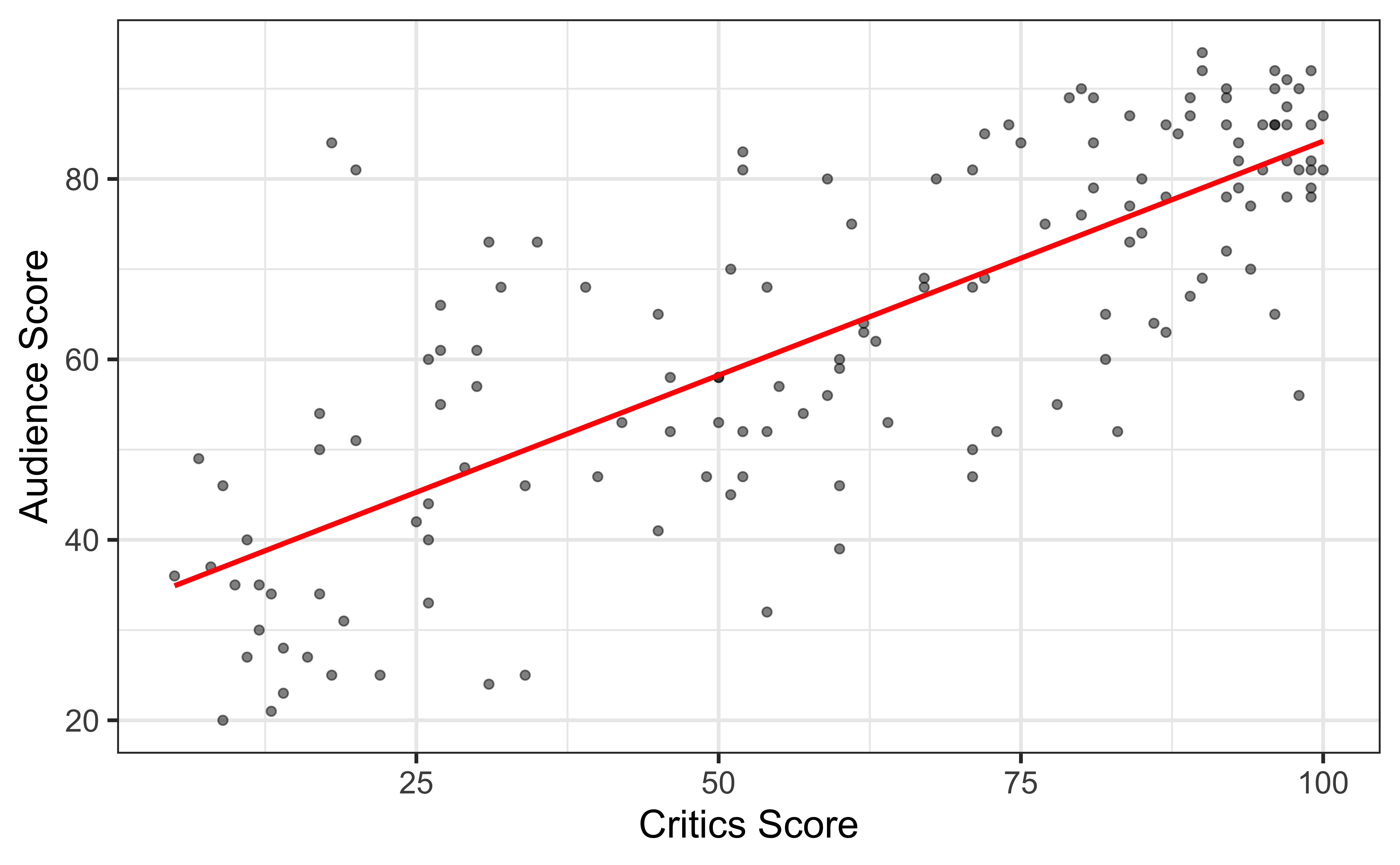 Goal: Fit a line to describe the relationship between the critics score and audience score.