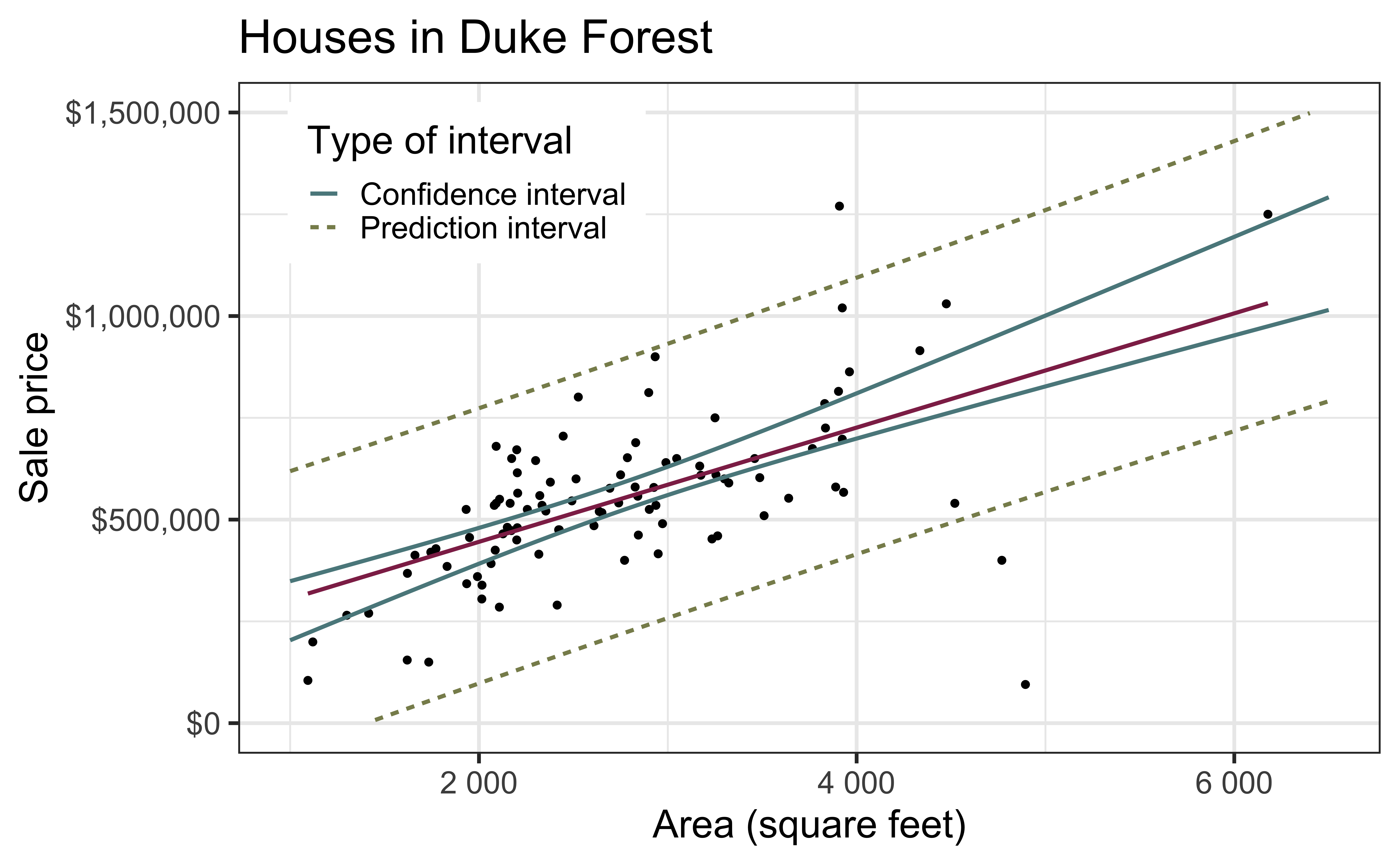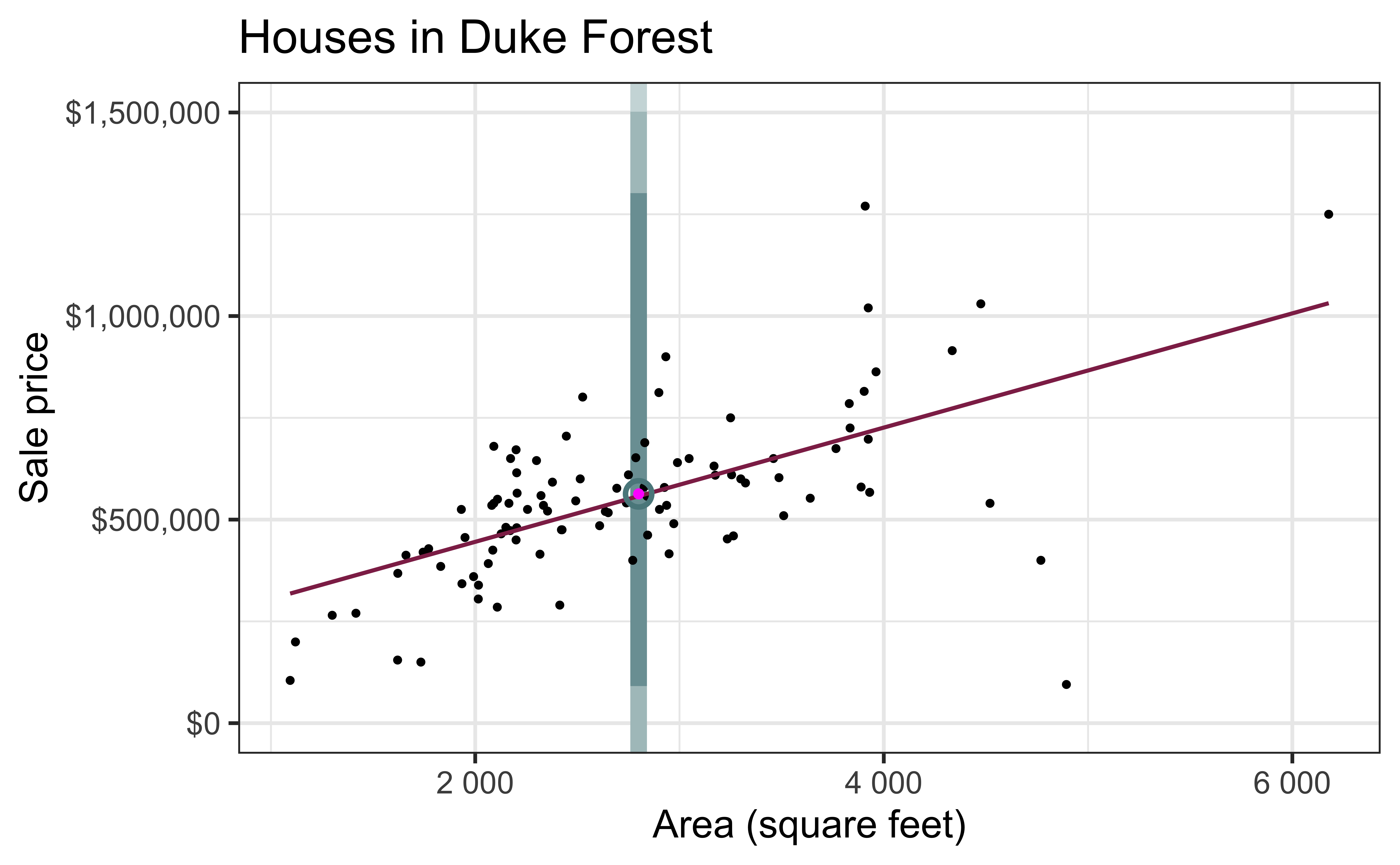 Prediction for an individual observation: “What is the predicted sale price of a Duke Forest house that is 2,800 square feet?”