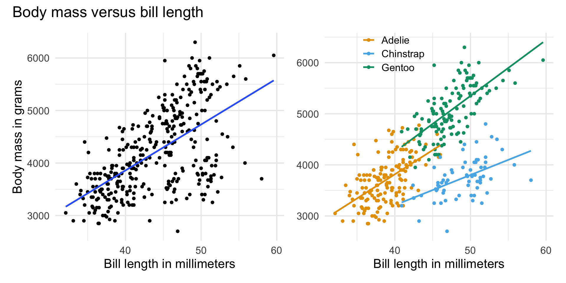 \[ \begin{aligned}\widehat{\text{body_mass_g}} ~ = \hat{\beta}_0 & + \hat{\beta}_1 \times \text{flipper_length_mm} \\ & + \hat{\beta}_2 \times \text{species}_1 \\ &+\hat{\beta}_3 \times \text{species}_2 \\ &+ \hat{\beta}_4 \times \text{bill_length_mm} \end{aligned} \]
