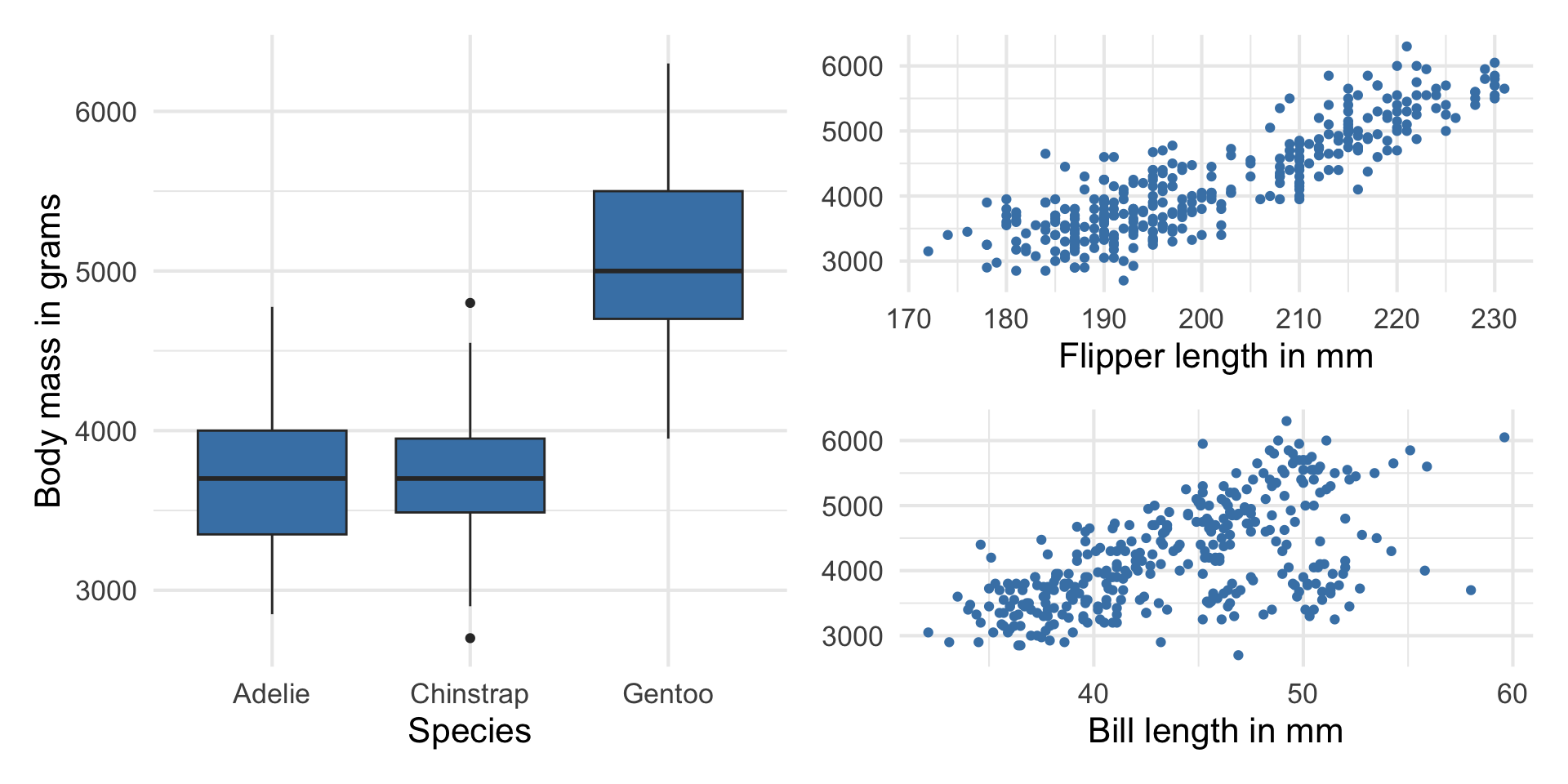bill_length_mm: Bill length in millimetersflipper_length_mm: Flipper length in millimetersspecies: Adelie, Gentoo, or Chinstrap speciesResponse: body_mass_g: Body mass in grams