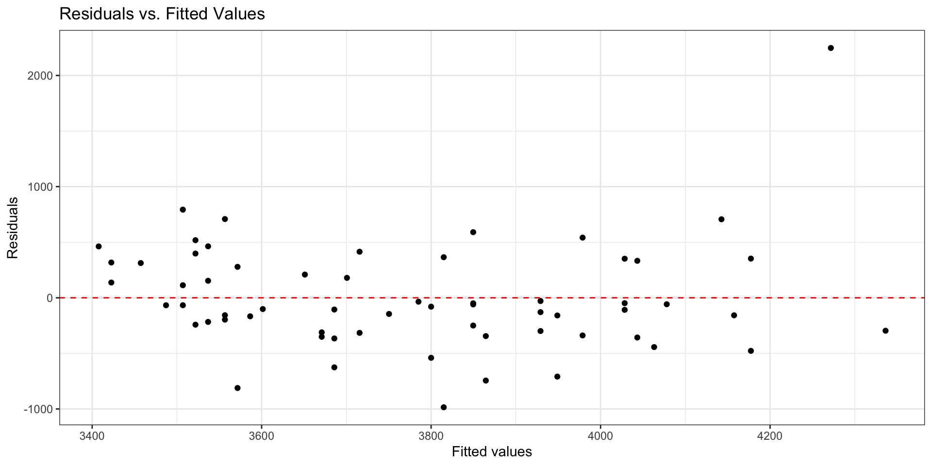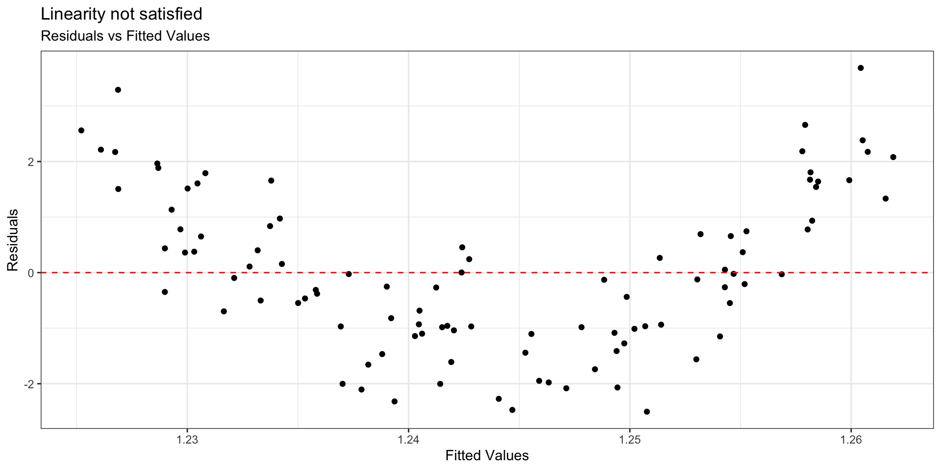 - Linearity is satisfied if there is no discernible pattern in the plot (i.e., points randomly scattered around \(residuals = 0\)