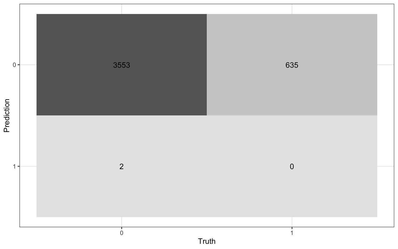 \[ \text{accuracy} = \frac{3553 + 0}{3553 + 635 + 2 + 0} = 0.848 \]