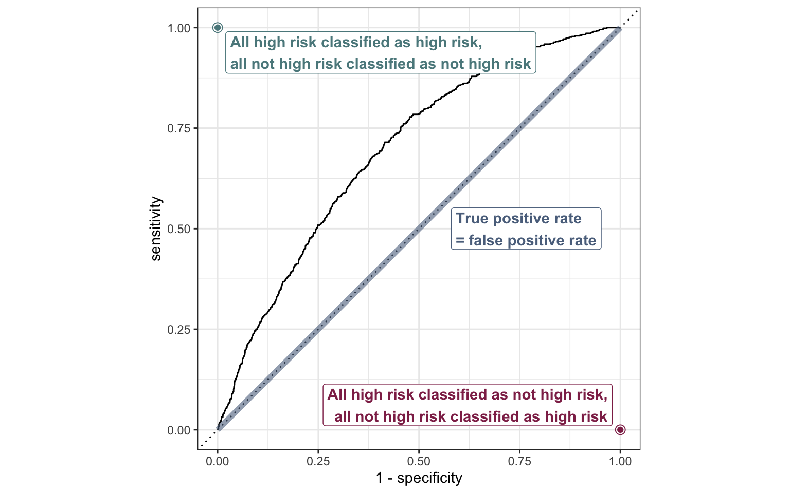 - P(classified not high risk | not high risk) = 1 − False positive rate