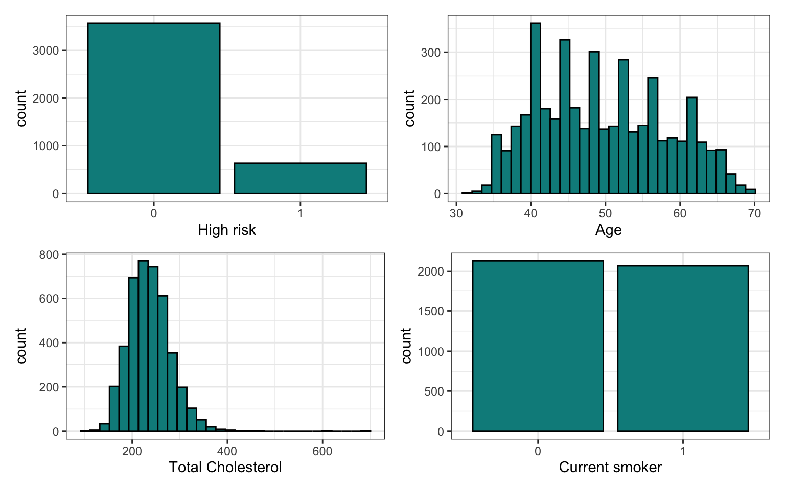 high_risk: 1 = High risk of having heart disease in next 10 years, 0 = Not high risk of having heart disease in next 10 yearsage: Age at exam time (in years)totChol: Total cholesterol (in mg/dL)currentSmoker: 0 = nonsmoker; 1 = smoker