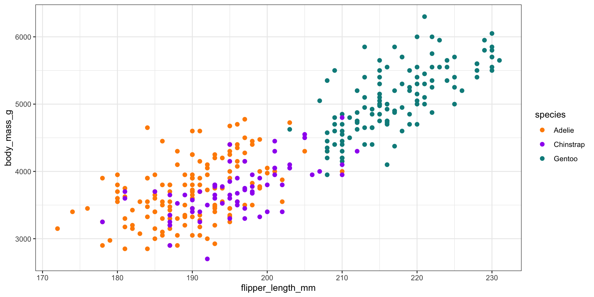 Below is a graph of association between flipper length in millimeters and body mass in grams of three species of penguins in Palmer Station, Antarctica. What are informative title and axis labels for this graph?